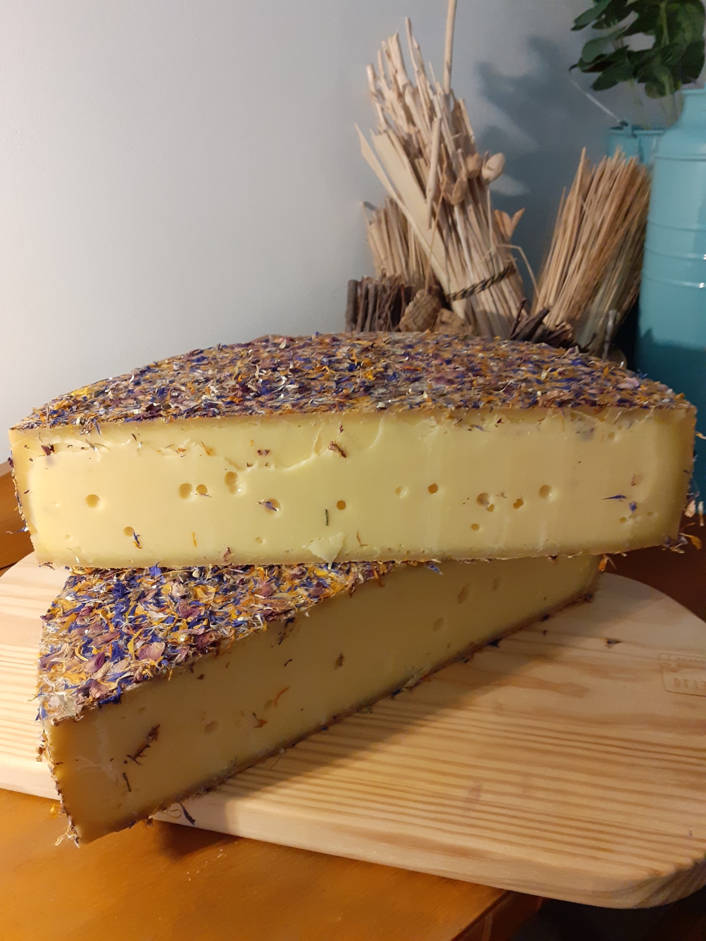 O queijo é amadurecido de numa cave de Kaeskuche, na Alemanha, é coberto com uma seleção de flores e ervas da montanha comestíveis (pétalas de rosa, malmequeres e alfazema) e ervas cultivadas nos prados circundantes.