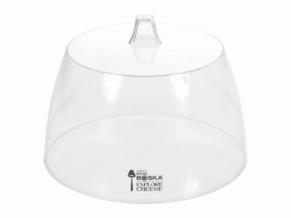 Tampa de vidro transparente para queijo com pega no topo e texto BOSKA EXPLORE CHEESE